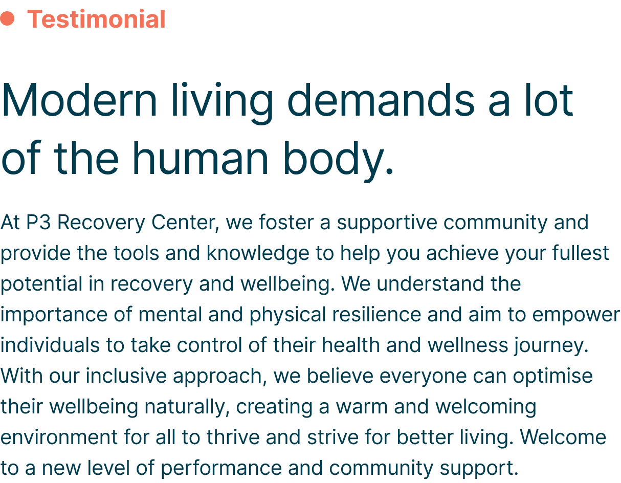 At P3 Recovery Center, we foster a supportive community and provide the tools and knowledge to help you achieve your fullest potential in recovery and wellbeing. We understand the importance of mental and physical resilience and aim to empower individuals to take control of their health and wellness journey. With our inclusive approach, we believe everyone can optimise their wellbeing naturally, creating a warm and welcoming environment for all to thrive and strive for better living. Welcome to a new level of performance and community support.